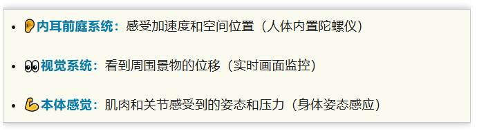 要理解这一点,我们首先需要弄清楚:人为什么会晕车?在医学界,晕车叫作“晕动症”,它的核心解释被称为“感觉冲突论”。简单来说,我们的大脑为了维持平衡,同时接收了三路信号: